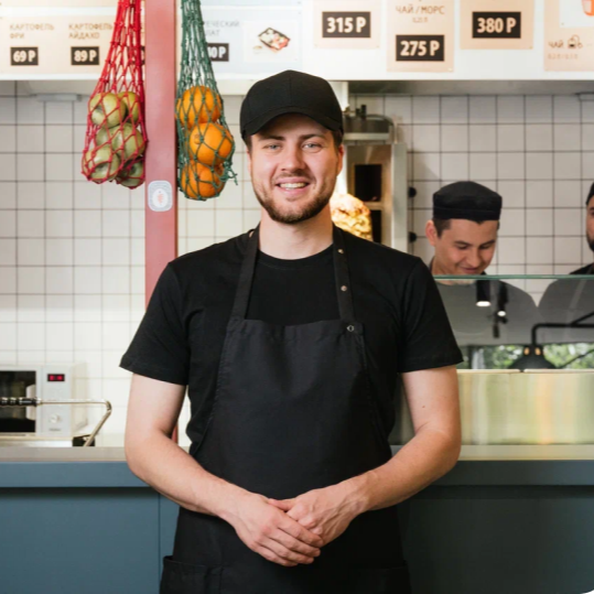 Работа на позициях повара и кассира в пиковые часы загрузки.